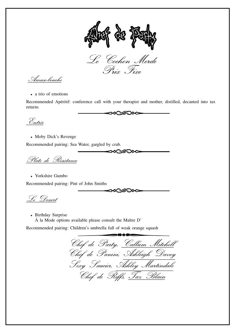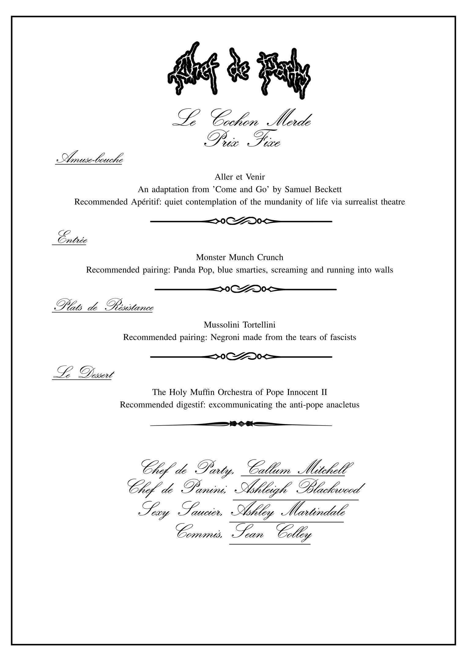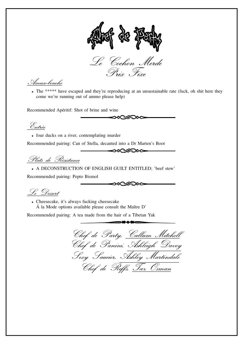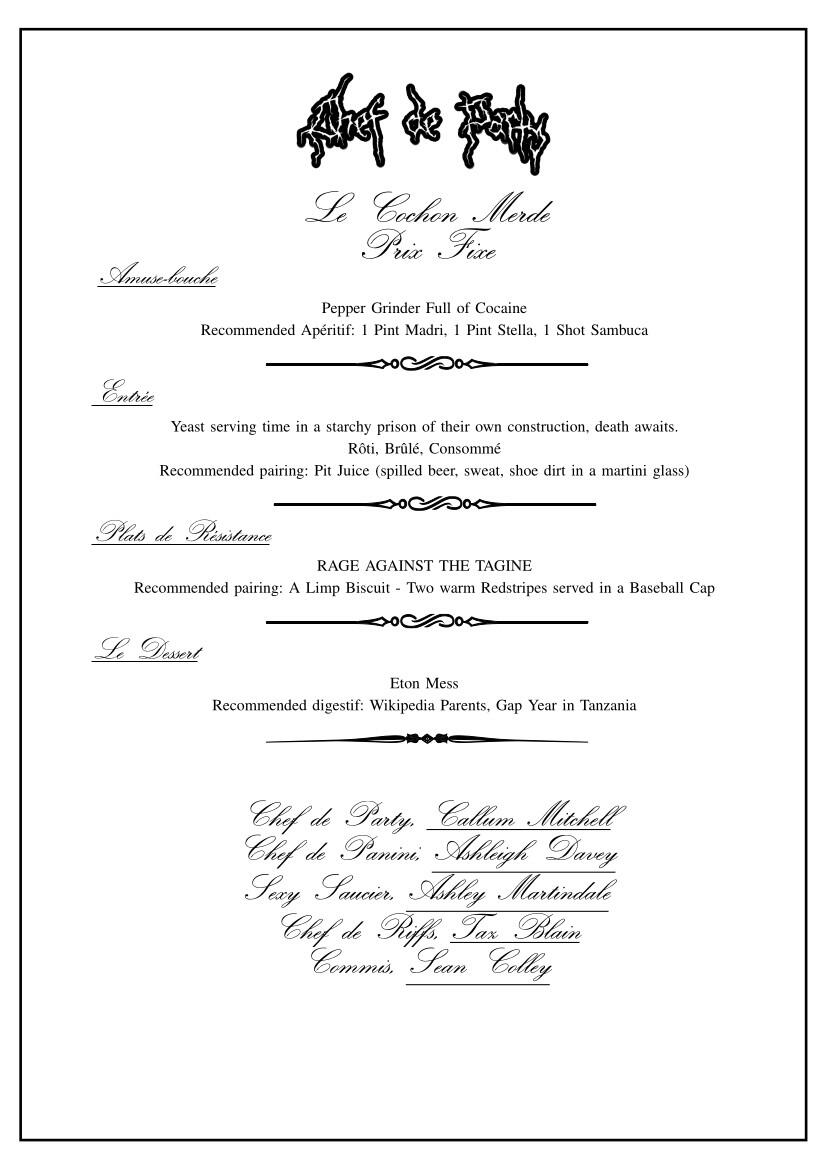 Our core philosophy at Le Cochon Merde is facilitating a breakdown of The Spectacle. What we aim to achieve is something that cannot be replicated, even by ourselves, all actions are a form of creation and destruction simultaneously. Our performances cannot be recorded, our patrons are required, your presence is necessary.That being said if you would like to purchase our recipes, please attend your nearest Chef de Party tasting menu evening.